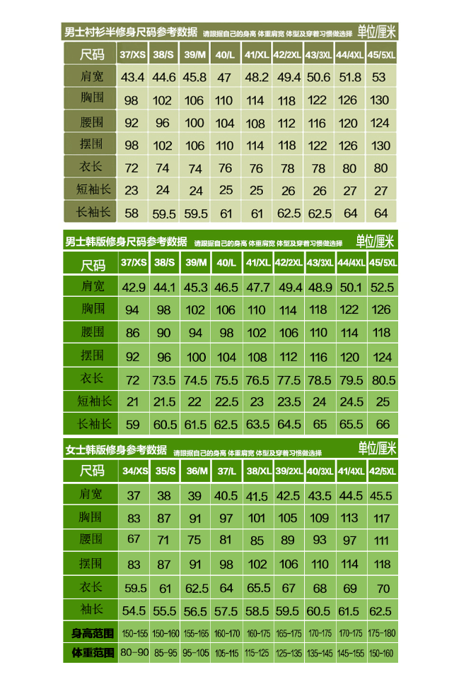 下面是男女襯衣和韓版男式襯衣尺碼表,可以從肩寬,胸圍,腰圍等大小,來定碼。