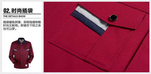 JL-QD203東莞廠服以棗紅色為主色,插袋采用拼接,夾克式袖口設(shè)計(jì),左肩筆袋,精致時(shí)尚,工作中非常方便