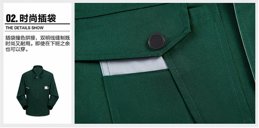 JL-QD225定做工作服以軍綠色為主調,領口采用淺灰色搭配,襯托出時裝者的時尚動感。甄選高品質面料,讓您穿著舒服,時尚。