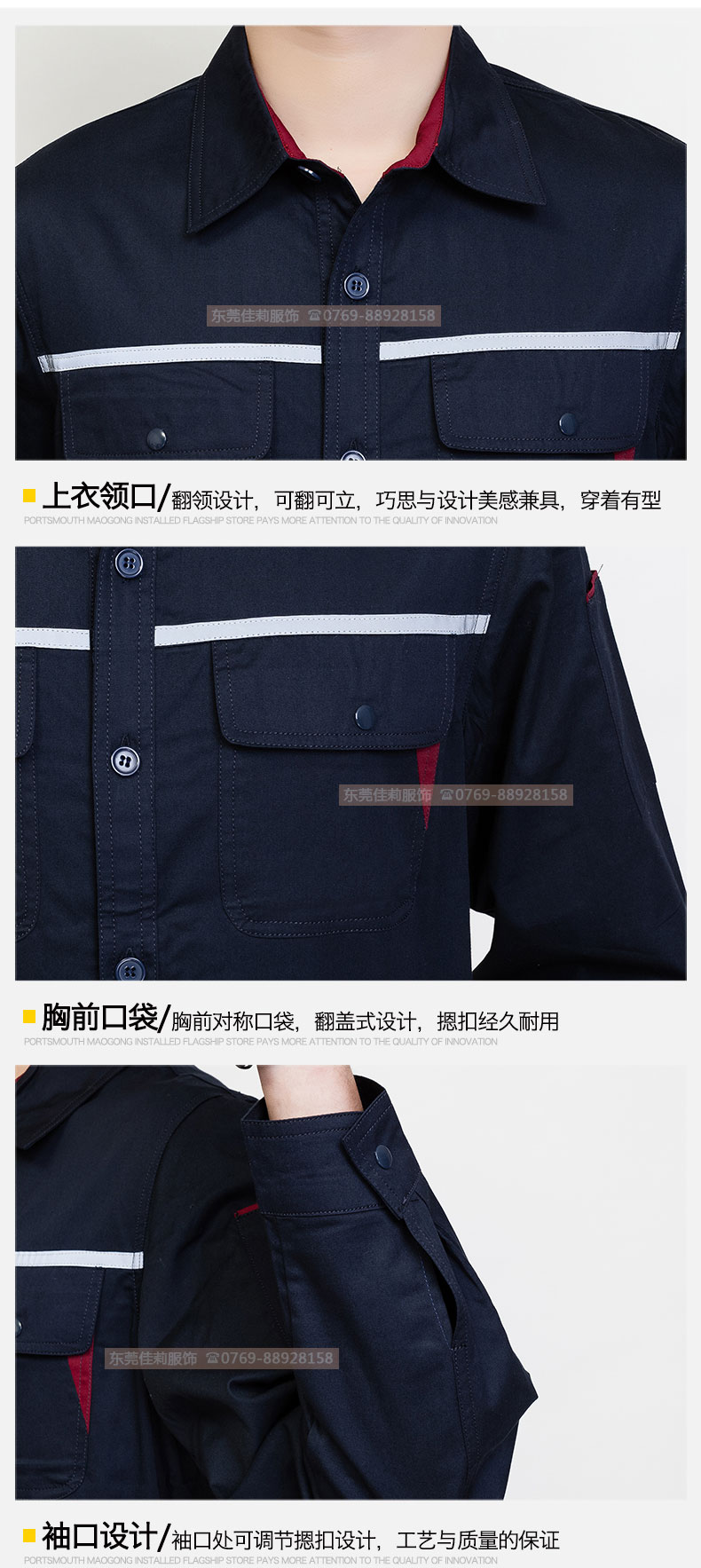 高品質(zhì)全新形象,經(jīng)典設(shè)計(jì),立體裁剪,時(shí)尚翻領(lǐng),質(zhì)感有型。走線細(xì)致,優(yōu)質(zhì)暗扣,實(shí)用性強(qiáng)。胸前口袋撞色拼接,雙明線縫制既時(shí)尚又耐用,即使在下班之余也可以穿。