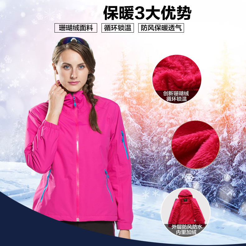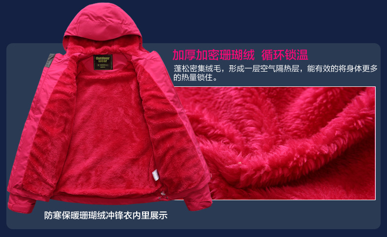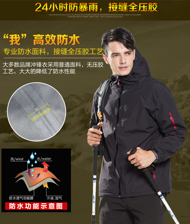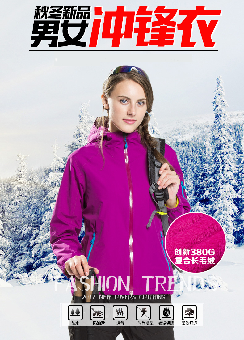 面料采用專業防水面料,選用380g復合長毛絨。衣服雙側口袋,滿足不同身材,不松不緊,穿著舒適。接縫全壓膠,防水透氣達到專業級別;